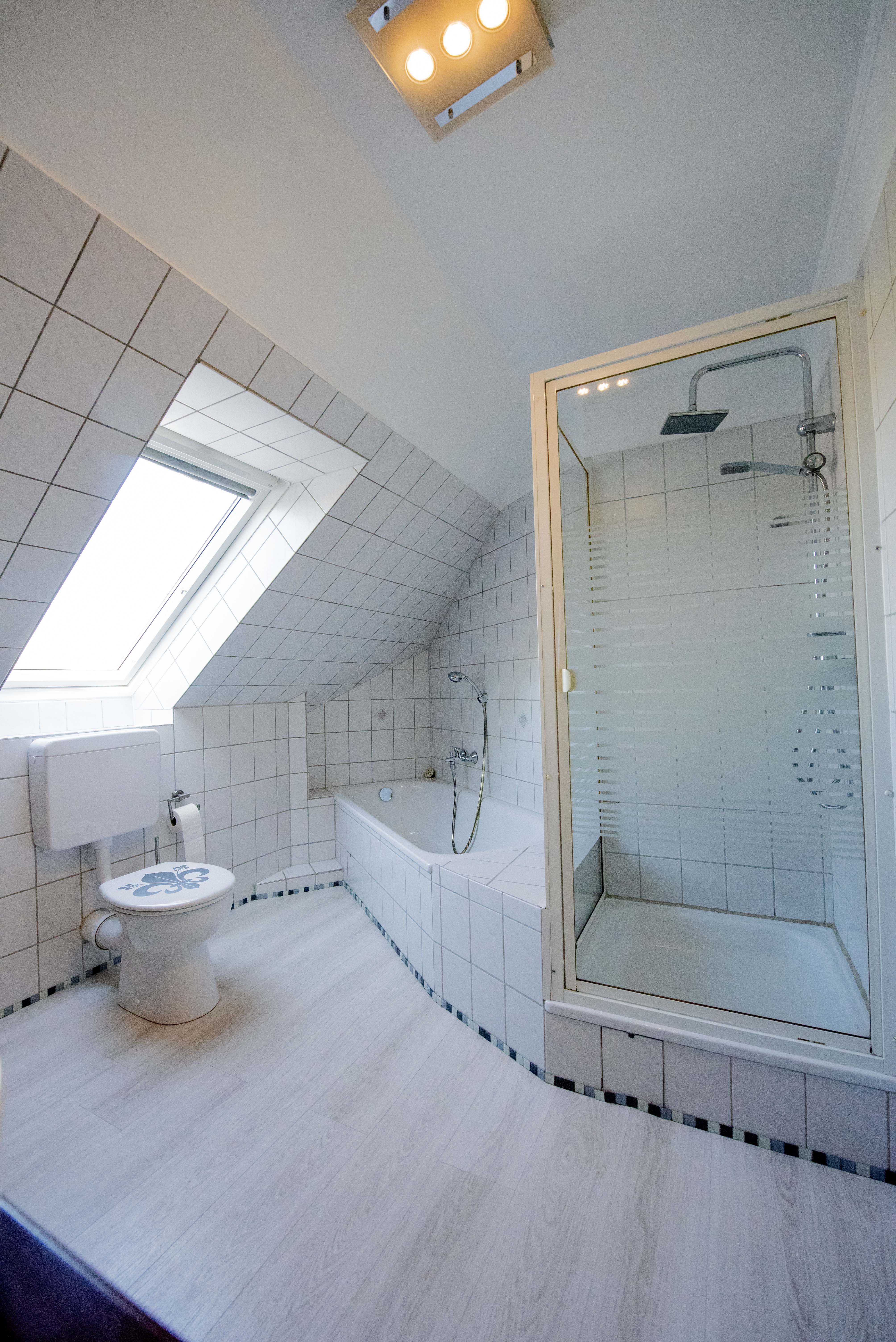 Badezimmer mit Dusche, Badewanne und Fenster